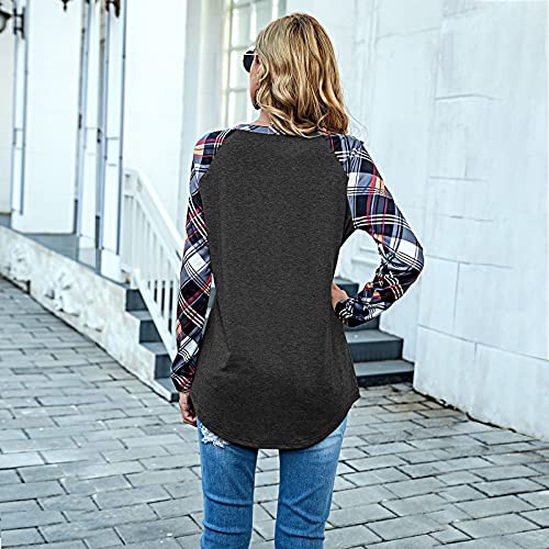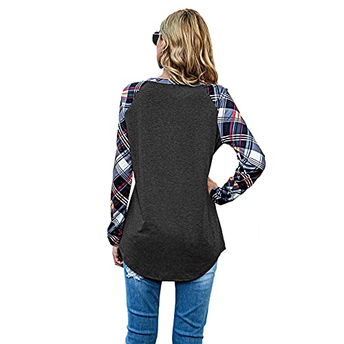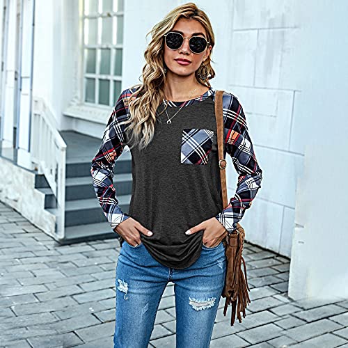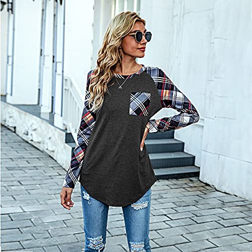 Briskorry Dames geruit splice shirt met lange mouwen mode losse ronde hals lange mouwen bovendeel lente herfst pullover comfortabel vrijetijdshemd oversized tuniek T-shirt blouse
