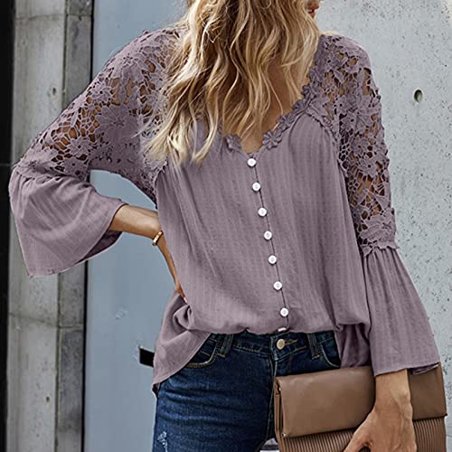 Briskorry Dames kant chiffon blouse V-hals elegant uithollen button down shirts tuniek lange mouwen pullover casual effen jumper shirt hemdblouse lange mouwen