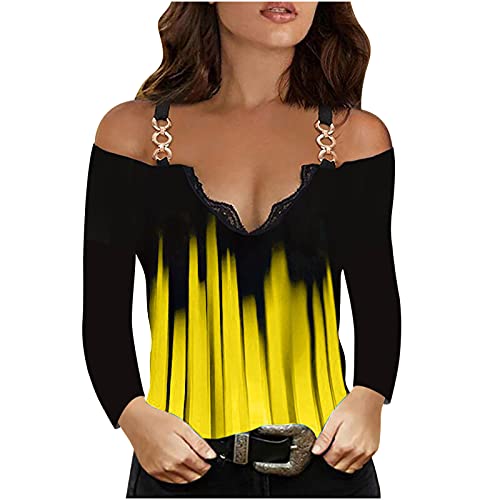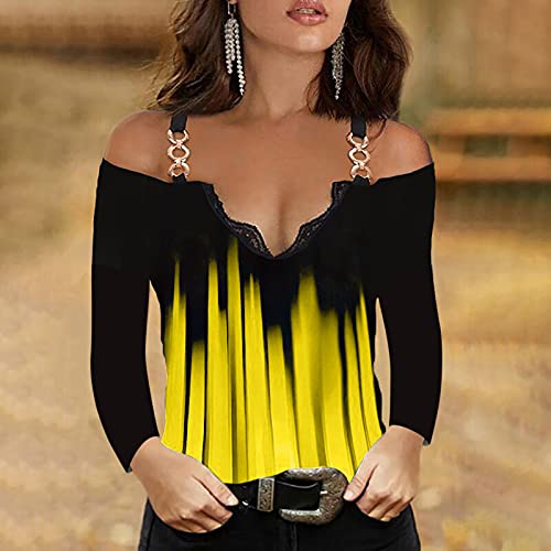 Specification: Briskorry Dames V-hals van kant lange mouwen shirts vlam print sexy metalen bandjes schoudervrij bovenstuk casual los sport sweatshirt streetwear T-shirt blouse