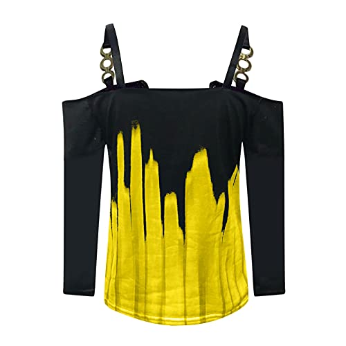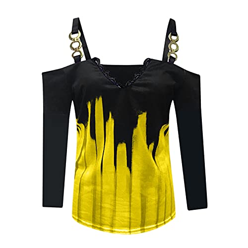 Briskorry Dames V-hals van kant lange mouwen shirts vlam print sexy metalen bandjes schoudervrij bovenstuk casual los sport sweatshirt streetwear T-shirt blouse