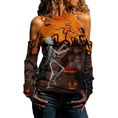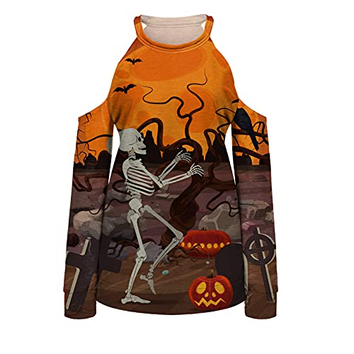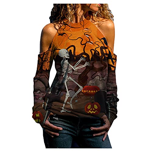 Briskorry Halloween halter-T-shirts dames horrorelement print lange mouwen bovenstuk herfst off-schouder sweatshirts mode lange mouwen casual tuniek losse blouse
