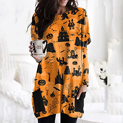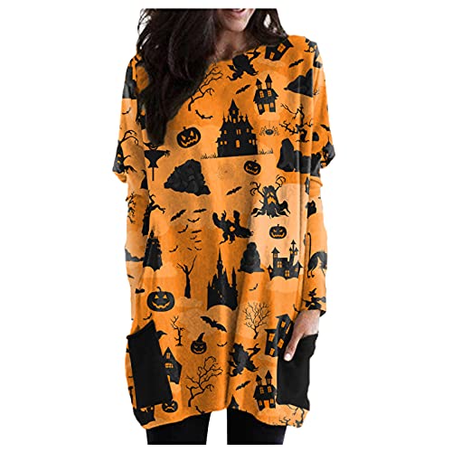 Specification: Briskorry Halloween ronde hals lange mouwen shirts pompoen bedrukt lange spliet pullover casual losse tops sweatshirt met zak festivalkostuums streetwear vrijetijdstop