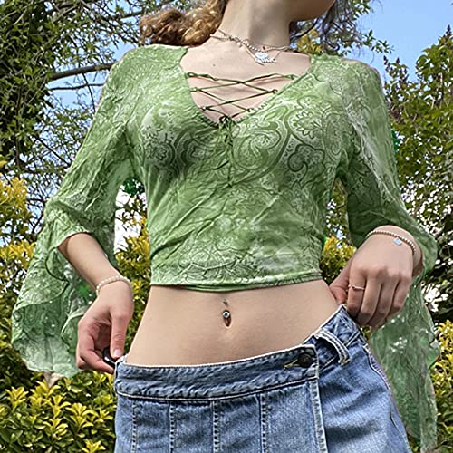 Specification: Briskorry Y2K Crop Tops voor dames, met lange mouwen, V-hals, grafische print, slim fit, t-shirt, modieus, voor e-meisjes, streetwear, zeefdruk, persoonlijkheid, crossover gesneden blouse met lange mouwen