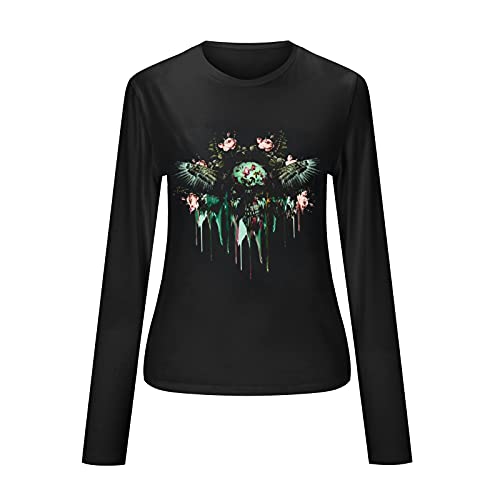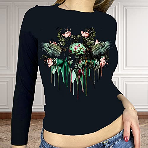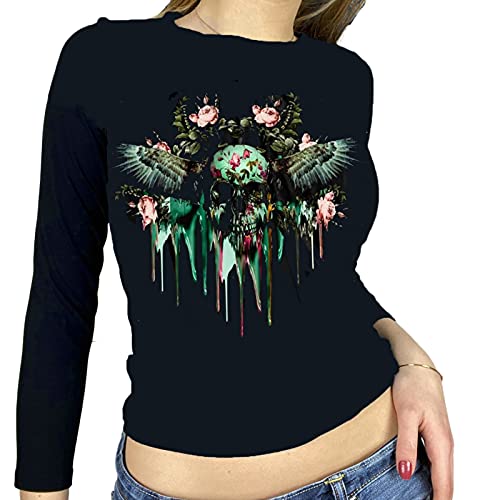 Briskorry Y2K T-shirt met doodshoofdprint voor dames, casual, lange mouwen, retro, ronde hals, herfst, mode, hipster, crop top, bovenstuk, jumper, shirt, streetwear, bovenstuk