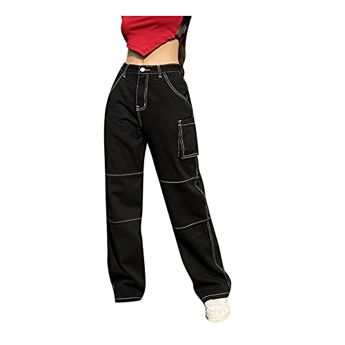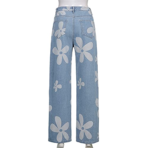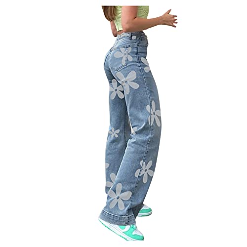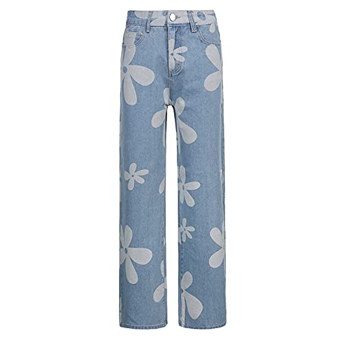 Specification: Eauptffy Dames rechte jeansbroek met wijde pijpen, Y2K Style Jeans met hoge taille, losse streetwear flared denim broek met bloemenprint streetwear vintage broek baggy straight leg broek